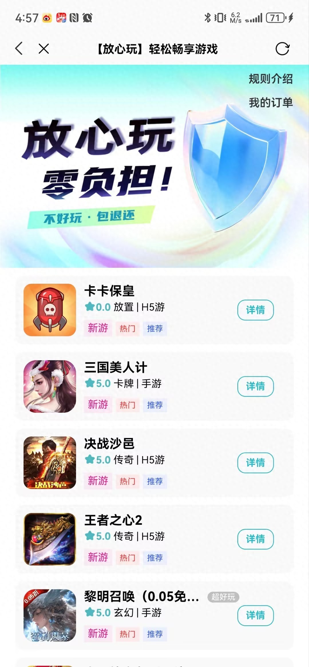 价值主张与入口设计:顶部横幅“不好玩·包退还”是前端写入的静态价值主张文案,其作用是在用户决策路径的起点建立明确认知。右侧“规则介绍”按钮通过事件绑定跳转到包含完整服务条款的独立页面,此设计符合金融科技产品对关键信息披露的强制性前端规范。